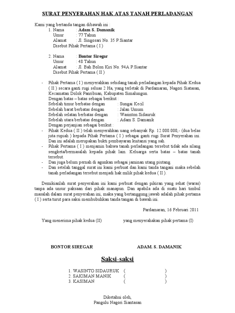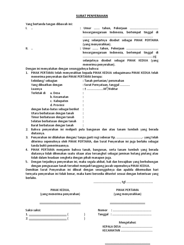 Yang bertanda tangan di bawah ini. Contoh surat pernyataan penyerahan tanah surat pernyataan penyerahan tanah merupakan bukti dokumen bahwa seseorang telah menyerahkan tanah yang dimilikinya kepada pihak lain baik itu melalui jual beli hibah ataupun lainnya. Cerai adalah masaalah yang menyebapkan putusnya hubungan suami istri.